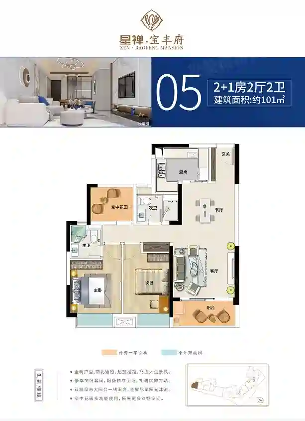 1、全明户型,南北通透,超宽楼距,尽览人生景致;2、豪华主卧套间,配备独立卫浴,礼遇优雅生活;